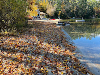 Very quickly all the leaves will be along the edge of the beach in the water when I go to pick them up. The tractor works ok, it is certainly easier for me to last longer than using a wheelbarrow to move all the leaves. The only real problem I’m finding so far, is that the tractor does not like the soft sand at all. Not a real big problem, next to the water is not a problem, I just need to limit the distance I have to travel to get off the beach. Nice little break riding up to dump and back though. If it only wasn’t an almost every day need. Oh well, I spend more time now in the water with boots on, than I spent in the water all summer. Maybe not, as this year I became aware of the volume of weeds constantly trying to spread into the swimming area. So I spent quite a bit of time weeding out the grass that tries to cover everywhere.
