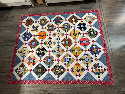 I mailed out the baby quilt today to Erin”s friends in Utah. I hope they like it. As I mentioned last time I rambled at you, I was almost finished with #24 for 2023, It’s done now. As I mentioned earlier, I placed the 7-1/2” blocks I came up with on point. I added sashing strips and corner stones and was very pleased with the outcome. On point is not my favorite to produce but I do like the results.